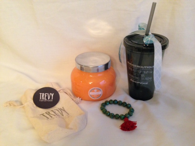 Gift set includes orange signature jar candle, Trevy handmade bracelet, drinking cup, and $25 gift care to VOGE