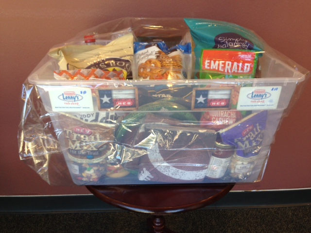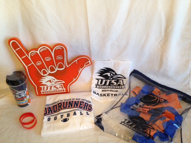 UTSA fan gear, including foam finger, string backpack, insulated travel mug, size large t-shirt, two rubber bracelets, and fan towel