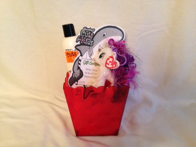 Gift set includes gift certificate for one boy or girl haircut, shampoo, and style; unicorn keychain, stick-on jewels, and Sharkey's fruity shampoo