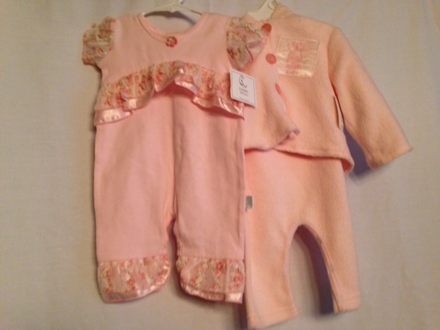 Two adorable pink baby girl outfits by Giggle Moon. Ruffled outfit is size 3 months; fleece outfit is size 6 months.